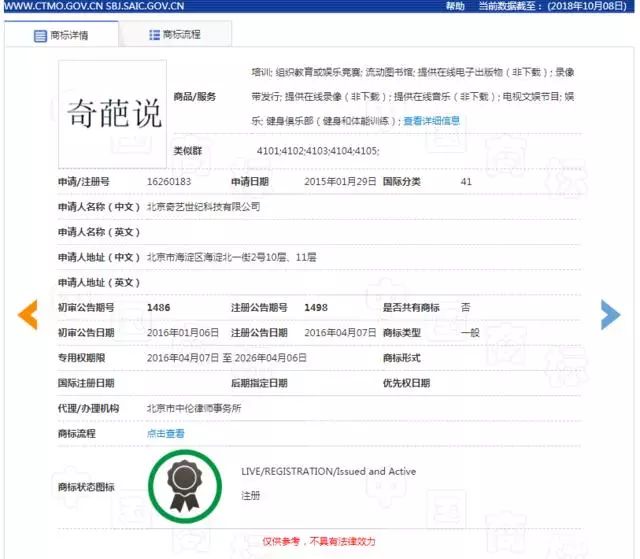 2016年4月,經(jīng)法律授權(quán),愛奇藝享有第16260183號(hào)注冊(cè)商標(biāo)“奇帕說(shuō)”的專用權(quán),“奇帕說(shuō)”商標(biāo)不僅用于節(jié)目的制作、播出和推廣,還與節(jié)目建立了密切的關(guān)系。
